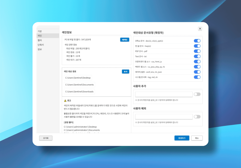 확장자별로 색인 대상을 세밀하게 지정하여 사용 환경에 꼭 맞는 검색 기반을 제공합니다.